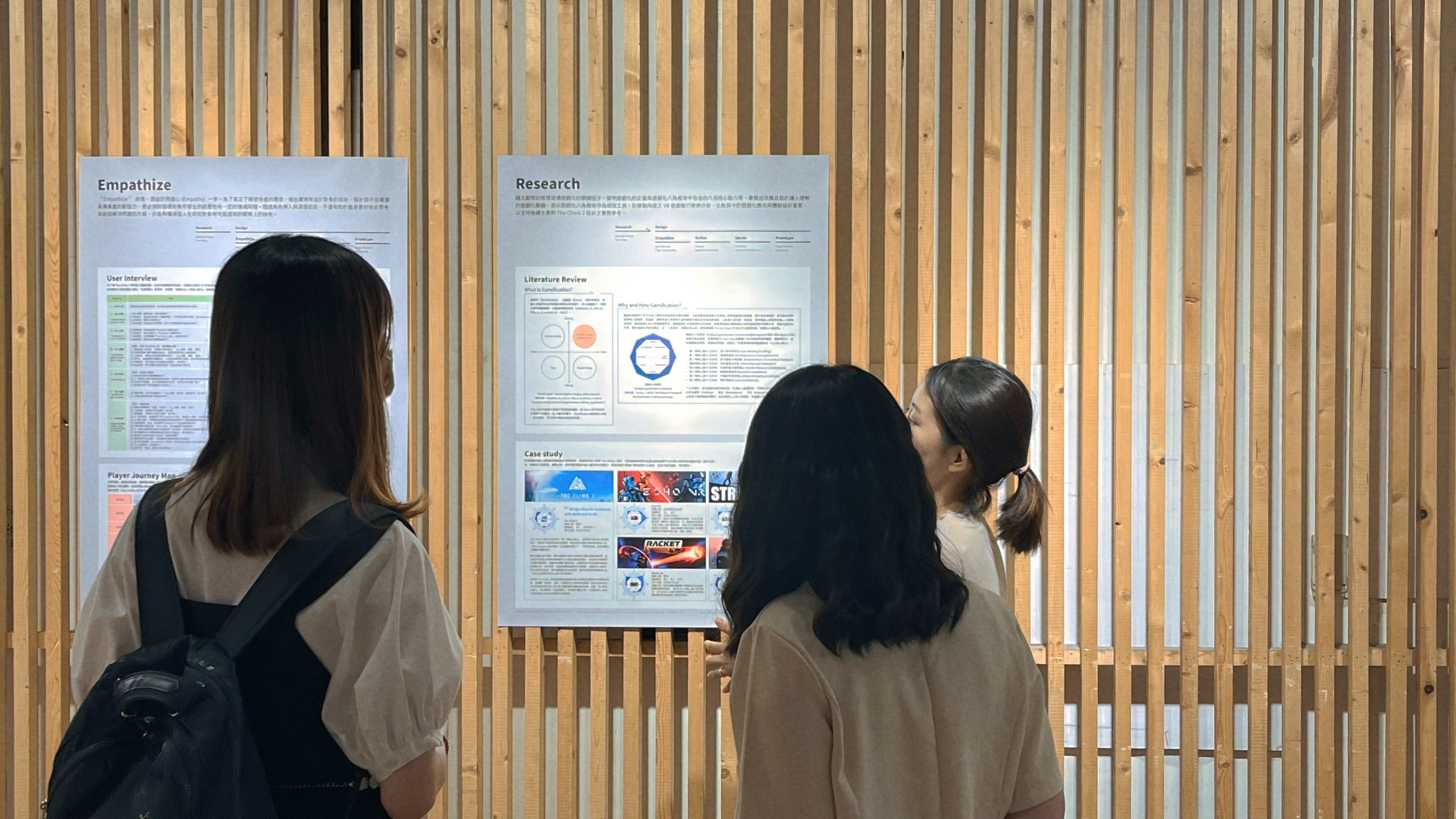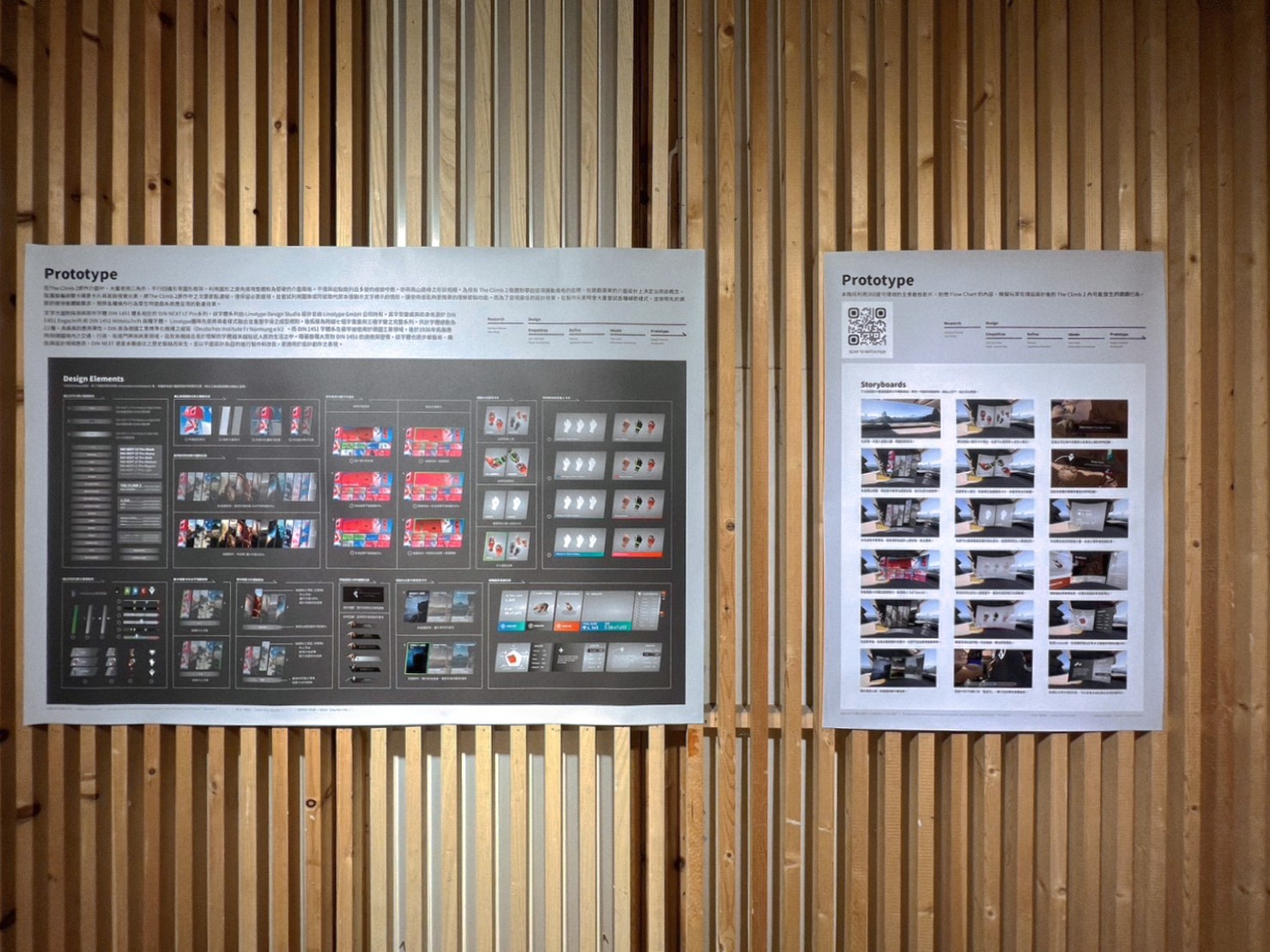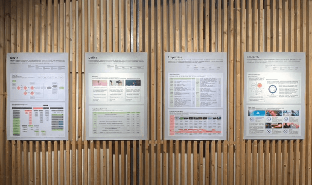The design outcomes of this study were publicly exhibited at the Taiwan Design Center - East Gate, NTNU. Aligned with the master’s degree graduation exhibition theme, “Think Too Much,” the display featured a dynamic video projection showcasing the gamification enhancements made to The Climb 2. The presentation was complemented by posters illustrating the complete research and design process.