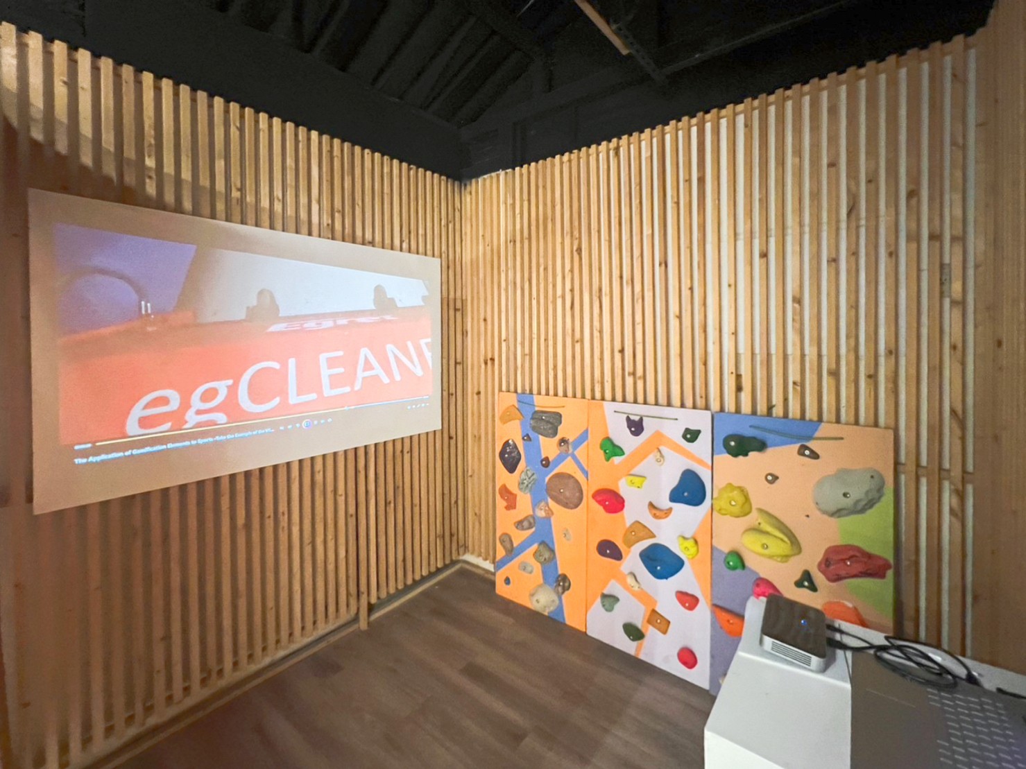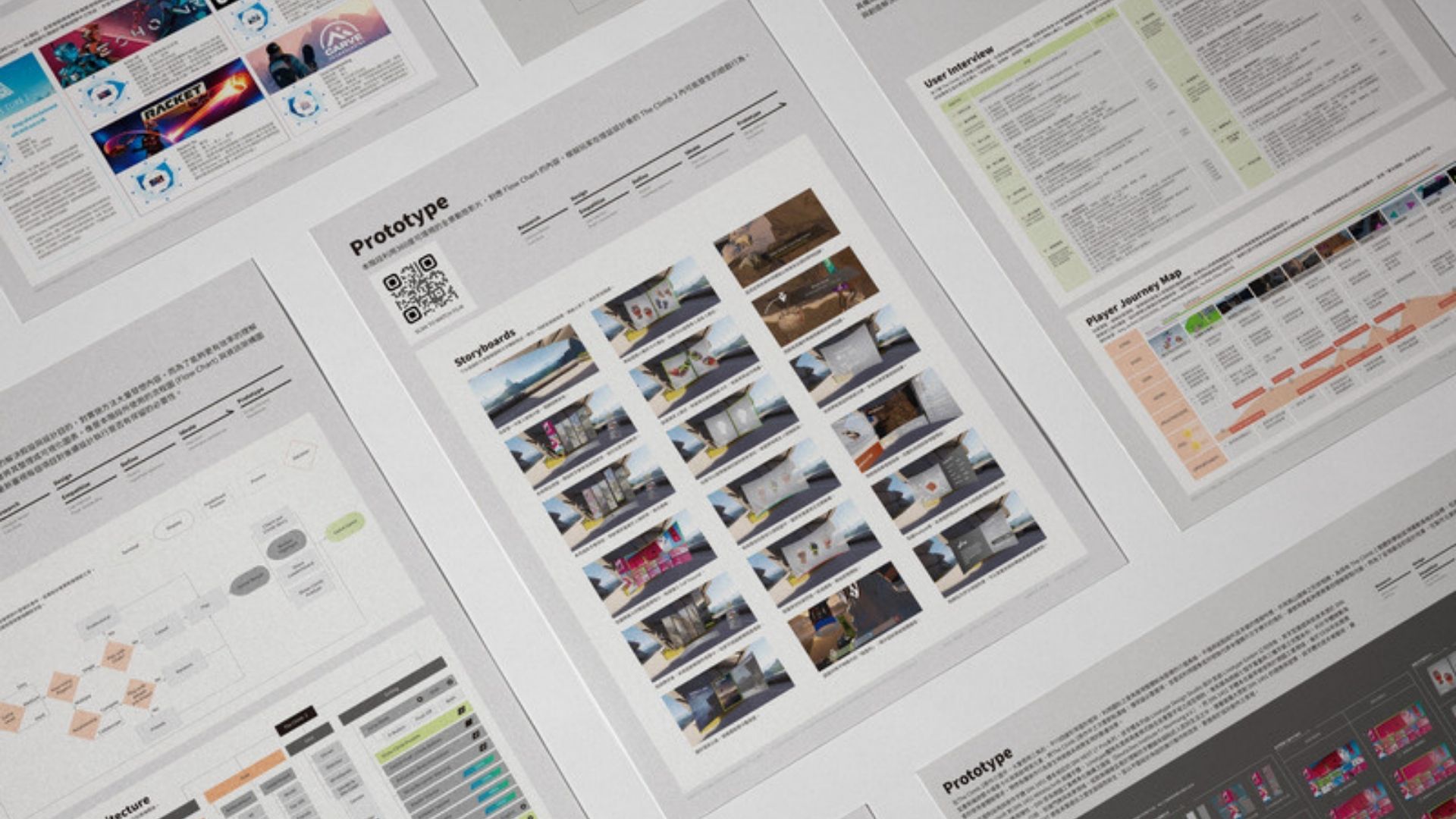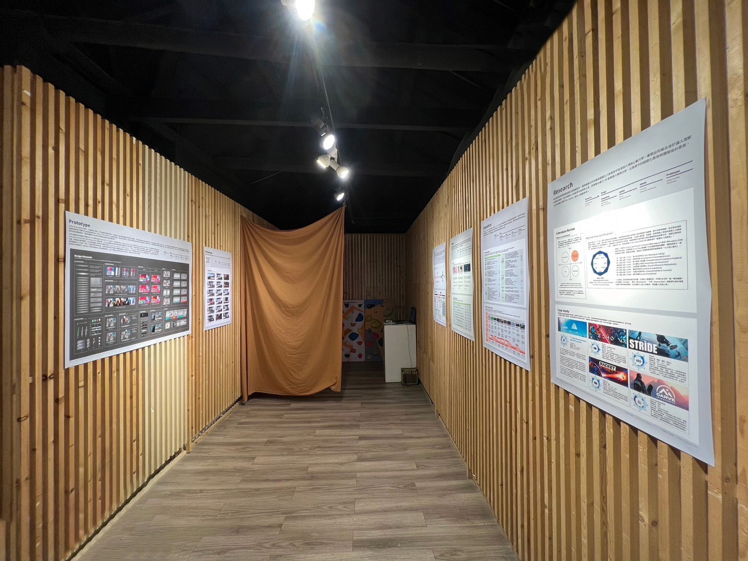 The design outcomes of this study were publicly exhibited at the Taiwan Design Center - East Gate, NTNU. Aligned with the master’s degree graduation exhibition theme, “Think Too Much,” the display featured a dynamic video projection showcasing the gamification enhancements made to The Climb 2. The presentation was complemented by posters illustrating the complete research and design process.
